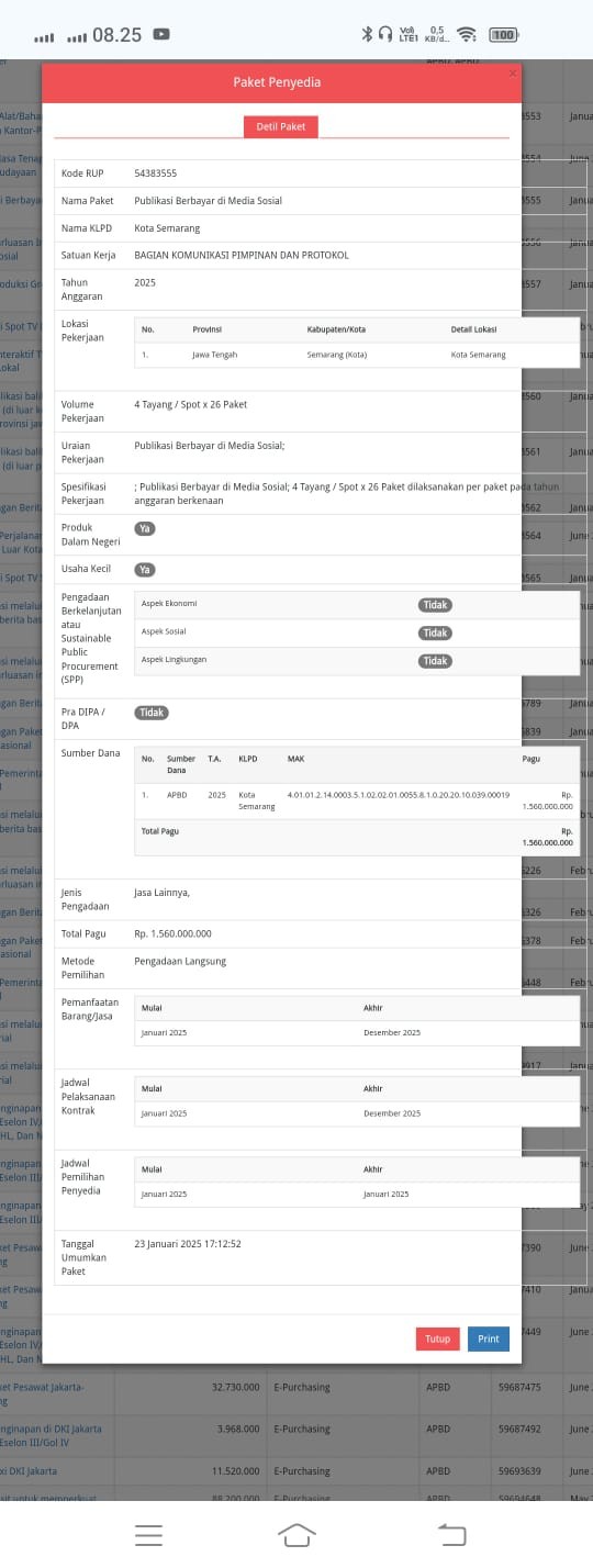 Alokasi terbesar tercatat untuk publikasi berbayar di media sosial dengan pagu anggaran Rp1,56 miliar, ditambah Rp700 juta untuk penyebarluasan informasi di platform yang sama. Total biaya khusus media sosial saja mencapai Rp2,26 miliar.