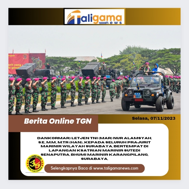 SURABAYA, TALIGAMA.COM – Komandan Komando Latih Korps Marinir (Dankolatmar) Kolonel Marinir I Made Sukada beserta Prajurit Kolatmar ikuti Exit Briefing Komandan Korps Marinir (Dankormar) Letjen TNI (Mar) Nur Alamsyah, S.E., M.M., M.Tr (Han)., kepada seluruh prajurit Marinir Wilayah Surabaya, bertempat di Lapangan Ksatrian Marinir Sutedi Senaputra, Bhumi Marinir Karangpilang, Surabaya, Selasa (07/11/2023).