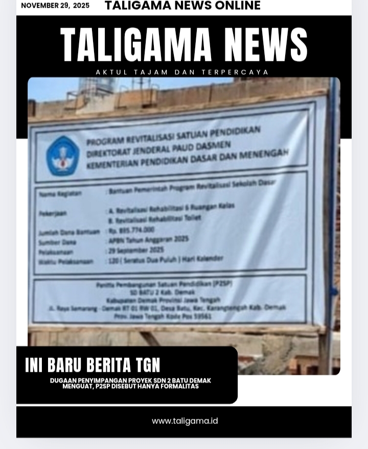 DEMAK, TALIGAMA.ID,– Proyek pembangunan Gedung SD Negeri Batu 2 di Jalan Raya Semarang–Demak, Desa Batu, Kecamatan Karangtengah, Kabupaten Demak, kini menjadi sorotan tajam. Proyek yang dibiayai Program Revitalisasi Satuan Pendidikan dari Direktorat PAUD Dikdasmen Kemendikdasmen tersebut mengantongi anggaran mencapai Rp 895.774.000. Namun, di balik nominal hampir Rp 900 juta ini, muncul indikasi penyimpangan yang menuntut penjelasan resmi dari pihak terkait.