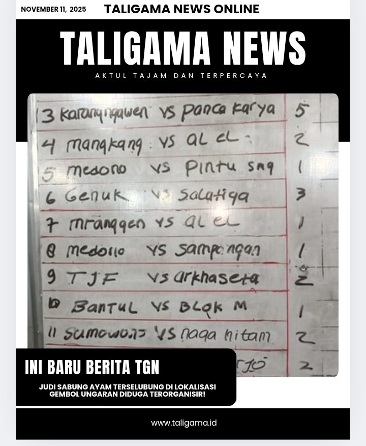 SEMARANG, TALIGAMA.ID, – Praktik judi sabung ayam kembali mencuat di Kabupaten Ungaran. Lokalisasi Gembol, yang selama ini dikenal sebagai kawasan remang-remang, kini diduga menjadi arena perjudian terselubung berkedok “adu ketangkasan ayam”. Informasi yang dihimpun tim Media menyebutkan, kegiatan sabung ayam tersebut rutin digelar setiap hari Selasa, Kamis, Sabtu, dan Minggu, bahkan menggunakan sistem undangan khusus dua minggu sekali bagi kalangan tertentu.