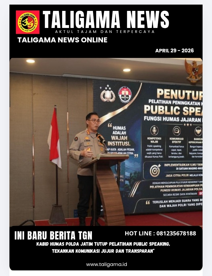 SIDOARJO, TALIGAMA.ID,– Kepala Bidang Hubungan Masyarakat (Kabid Humas)Polda Jawa Timur, Kombes Pol Jules Abraham Abast resmi menutup kegiatan Pelatihan Peningkatan Kemampuan Public Speaking Fungsi Humas Jajaran Polda Jatim Tahun Anggaran 2026 yang digelar di Sidoarjo, Rabu (29/4/2026).