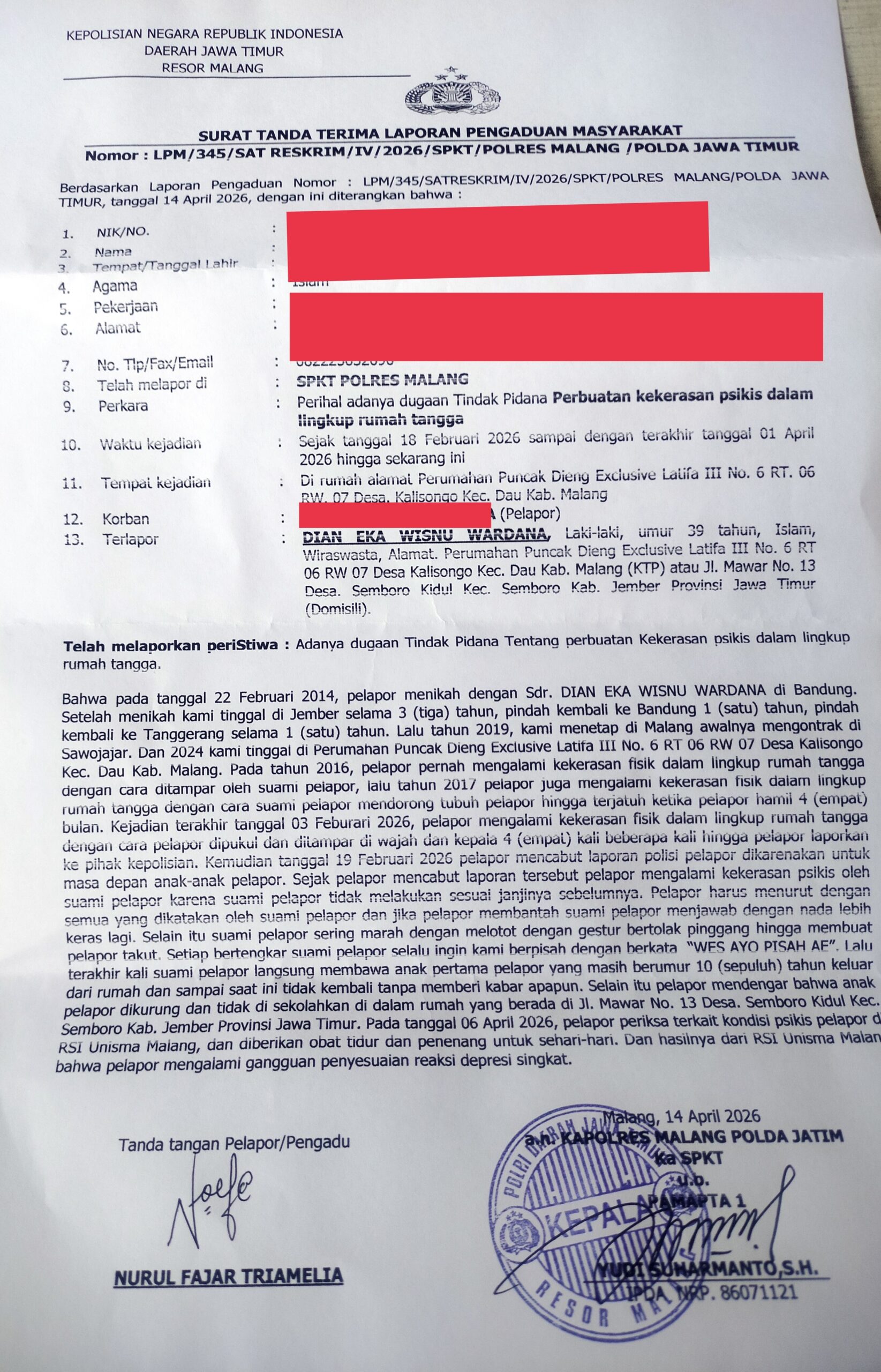 MALANG, TALIGAMA.ID, – Polres Malang kembali menindaklanjuti laporan kasus Kekerasan Dalam Rumah Tangga (KDRT) yang terjadi di wilayah hukumnya. Berbeda dengan kasus sebelumnya, kali ini korban menolak keras upaya perdamaian atau musyawarah keluarga lantaran sudah mengalami trauma mendalam dan ini merupakan kali kedua korban melapor ke polisi karena perlakuan suaminya. Sehingga korban mengalami depresi berat. Selasa (14/04/26)