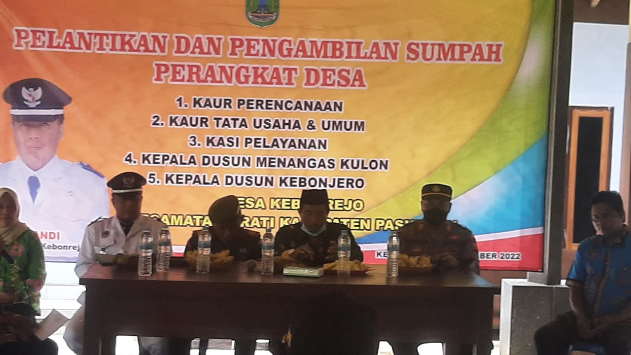 PASURUAN, TALIGAMA.COM – Kepala Desa Kebonrejo Kecamatan Grati Kabupaten Pasuruan Supandi melantik dan pengambilan sumpah perangkat desa baru bertempat di balai Desa Kebonrejo kecamatan Grati kabupaten Pasuruan Kamis, 01 Desember 2022.