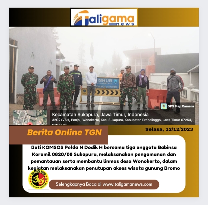 PROBOLINGGO, TALIGAMA.COMv–Bati KOMSOS Pelda N Dodik H bersama tiga anggota Babinsa Koramil 0820/08 Sukapura, melaksanakan pengamanan dan pemantauan serta membantu linmas desa Wonokerto, dalam kegiatan melaksanakan penutupan akses wisata gunung Bromo (12/12/2023).