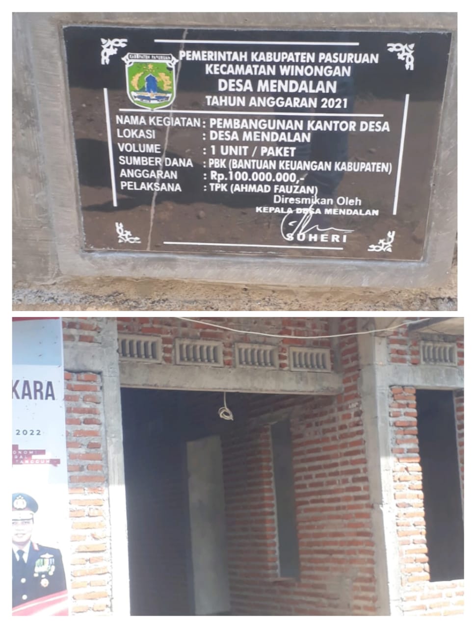 PASURUAN,TALIGAMA NEWS – Pembangunan kantor Desa Mendalan, Kecamatan Winongan, Kabupaten Pasuruan yang dananya di anggarkan dari bantuan keuangan Kabupaten (PBK) Senilai Rp.100.000.000.- ,yang seharusnya telah selesai, namun pada kenyataannya sampai saat ini sudah hampir Satu Tahun. Pembangunan Kantor Desa tersebut belum selesai dikerjakan. Padahal sumber dana dari keuangan Kabupaten tersebut Di Duga telah turun sebelumnya.