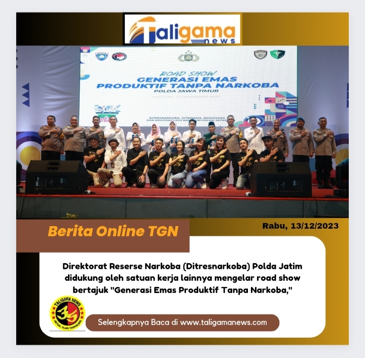 KOTA MALANG, TALIGAMA.COM – Dalam rangka menekan peredaran gelap narkoba di lingkungan Pelajar di Jawa Timur, Direktorat Reserse Narkoba (Ditresnarkoba) Polda Jatim didukung oleh satuan kerja lainnya mengelar road show bertajuk “Generasi Emas Produktif Tanpa Narkoba,” pada Rabu (13/12).