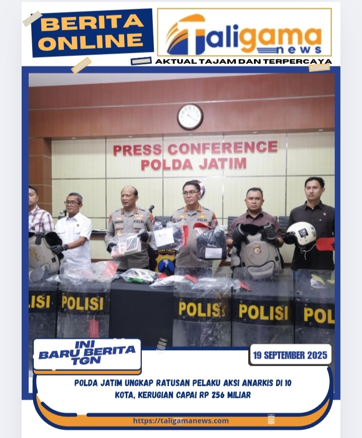 SURABAYA, TALIGAMA.ID,– Polda Jawa Timur merilis perkembangan penanganan kasus perusakan, penjarahan, dan pembakaran fasilitas umum yang terjadi dalam rangkaian aksi anarkis di sejumlah wilayah Jatim, Kamis (18/9/2025) di Gedung Press Conference Bidhumas Polda Jatim.