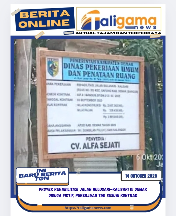 DEMAK, TALIGAMA.ID, – Proyek Rehabilitasi Jalan Bulusari–Kalisari (Ruas No. 03) di Kecamatan Sayung, Kabupaten Demak, diduga bermasalah. Berdasarkan hasil penelusuran di lapangan, proyek dengan nilai kontrak sebesar Rp 2.657.362.000, yang bersumber dari APBD Kabupaten Demak Tahun Anggaran 2025 di bawah Dinas Pekerjaan Umum dan Penataan Ruang (PUPR), terindikasi tidak dilaksanakan sebagaimana mestinya alias fiktif.